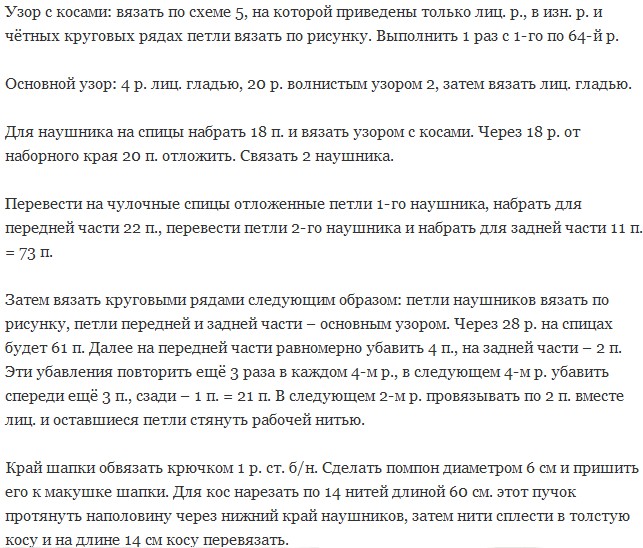 Узор- коса, идущий по бокам модели, делает эту шапку необычной. Для вязания шапки использована толстая шерстяная пряжа, за счет чего эта шапка получилась очень теплая. Косички на ушках и небольшой помпон на шапке придают игривость образу. Эта шапка отлично подходит для молоденьких и стильных девушек!