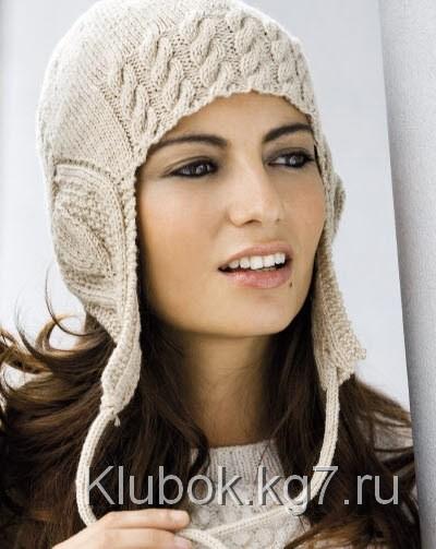 Для каждого уха: набрать 16 п. на спицы № 3.5. Вязать: 3 п. платочной вязкой , 2 п. изн. глади, 6 п. косы, 2 п. изн. глади, 3 п.платочной вязкой, 5-ое скрещевание косы соответствует скрещению (1 ) схемы, который начинает ромб Оставить в ожидании после 18 р. ромба и вязать 2-ое такое же ухо, набрать 26 п. (затылка),продолжить вязать п. 1-ого уха, набрать 50 п. ( переда), вязать п. 2-ого уха, затем продолжить 26 п. (затылка). Вязать таким образом: * 2 п. изн. глади джерси. 6 п. косы * 3 раза, 2 п. изн. глади, продолжить ромб на п. уха, заменяя платочную вязку лиц. гладью,* 2 п. изн., 6 п. косы * 6 раз, 2 п. изн. глади, продолжить ромб на п. уха, заменяя платочную вязку лиц. гладью. * 2 п. изн. глади, 6 п. косы * 3 раза. 2 п. изн.глади. Продолжить лиц. над косами затылка и переда после 4-ого скрещевания,продолжить косы над каждым ромбом до конца работы. Образовать верх, распределяя 4 убавления на каждой половине затылка, 7 на переде в 13-ом., 21-ом, 27-ом, 31-ом, 35-ом, 37-ом, 39-ом,41-ом, 43-ем и 45-ом р. после кос. Продеть нить в оставшиеся п. Стянуть и оставить работу. Сшить шапку тонким швом. Изготовить 2 полосы длиной 30 см. Пришить по одной внизу каждого уха.