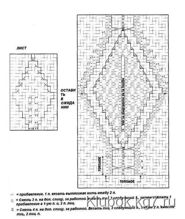 Косы: вязать 6 первых п., схемы ромба повторять 6 р.* Ромб и листик: следовать схеме.