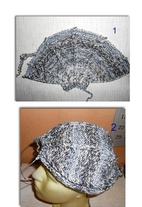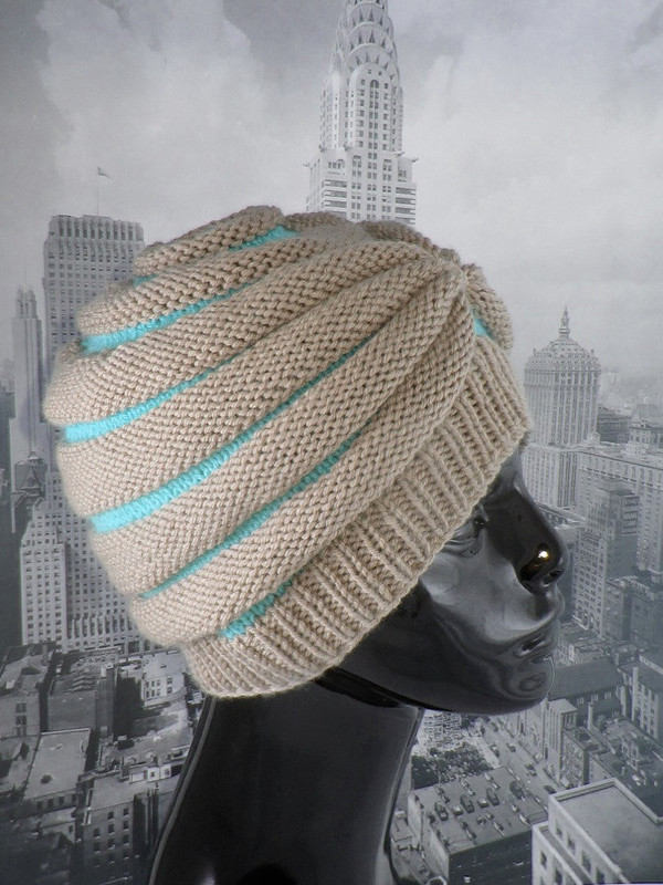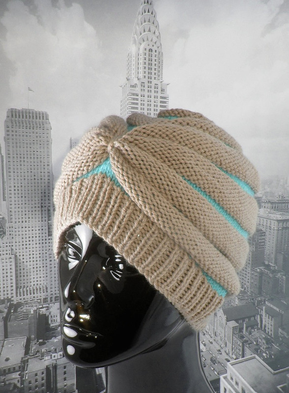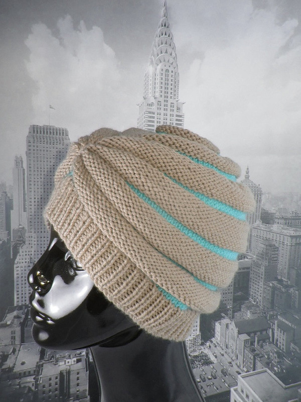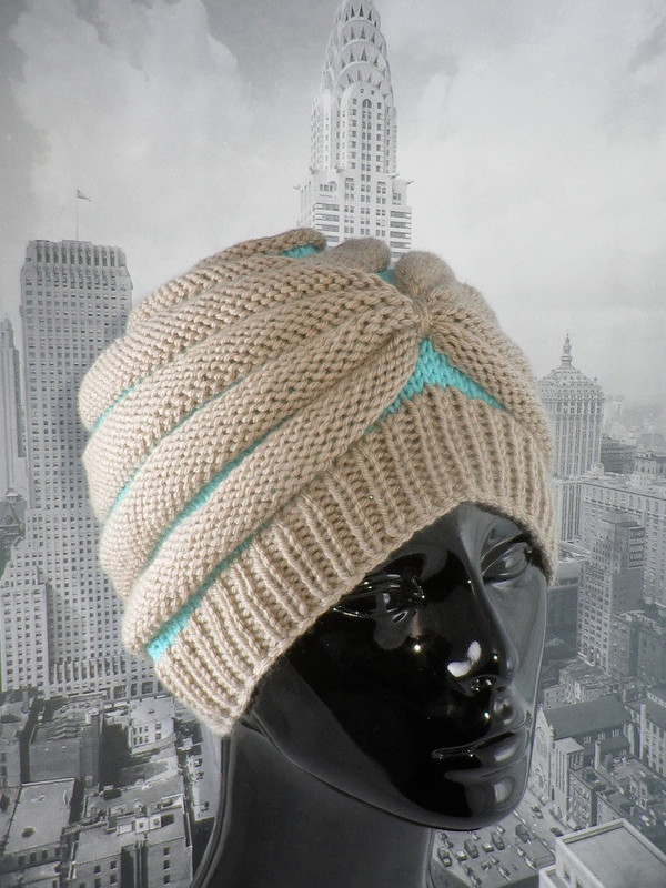 Эта шапка начинается с небольшого кольца Мёбиуса, связанного секциями лицевой и изнаночной глади. Спереди чалма, а сзади классический колокол.