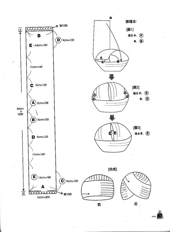 Согните углы по направлению вниз (схема B), сшейте края как на схеме С (треугольники образуют верх шапки).