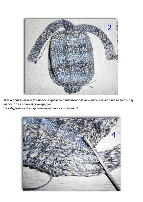Затем привязываем эти полосы крючком "зигзагообразным швом" (зацепляла то за основу шапки, то за планку) поочередно.