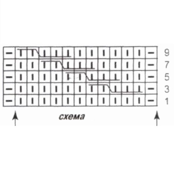 Раппорт узора в ширину составляет 12 петель. На схеме показаны только лицевые/нечётные ряда, но при вязании шапки по кругу каждый второй ряд нужно вязать по рисунку петель.