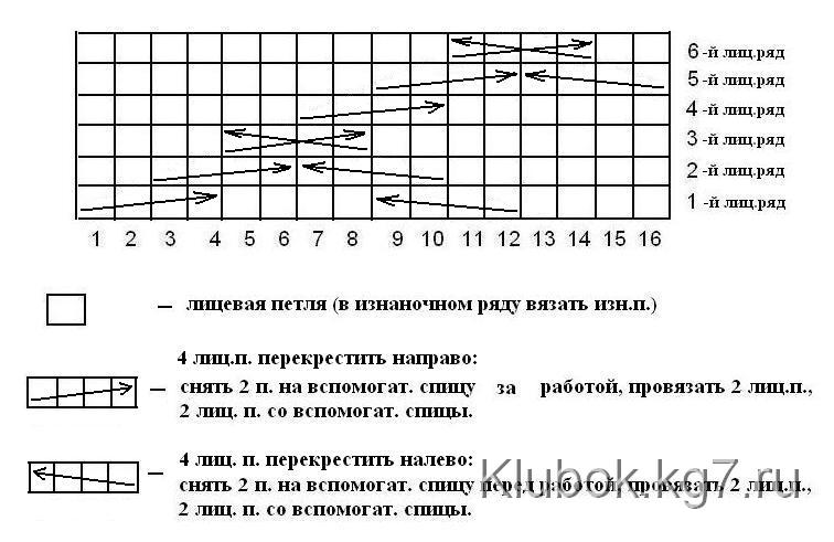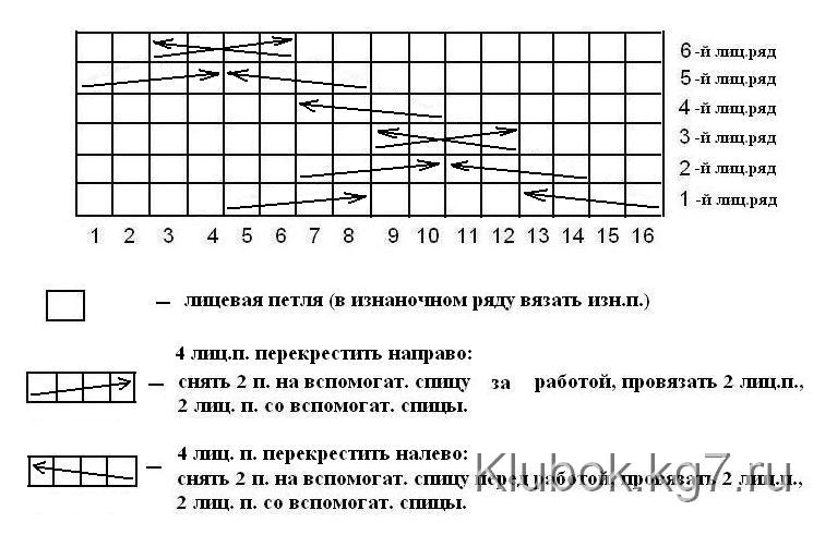 2.4 лиц. перекрестить направо- снять 2 петли на вспомогательную спицуза работой, провязать 2 лиц. петлм, 2 лиц. петли со вспомогательной спицы
