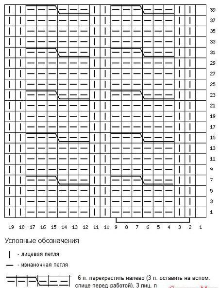 1 ряд: 1к, 2и, 6л, 2и, 6л, 2и, 6л, 2и, 6л, 2и, 6л, 2и, 6л, 2и, 6л, 2и, 6л, 2и, 1к к - кромочная, л - лицевая, и - изнаночная