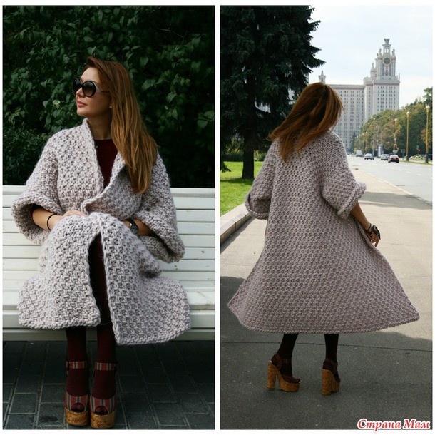 Набирает популярность толстая пряжа. Вот очередная моя работа из испанской пряжи Muka. 100 % овечья шерсть. 100гр/40м. Ушло 17,5 мотков. Спицы №15 на леске. Вяжется легко и приятно. Рисунок простой. Жемчужный узор на два ряда.
