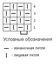 Рисунок проявляется при чередовании лицевых и изнаночных петель. Рапорт узора 2 петли и 4 ряда. Для вязания создана схема с лицевыми и изнаночными петлями. Лицевые ряды читайте справа налево (1 и 3 ряд), изнаночные слева направо (2 и 4 ряд).