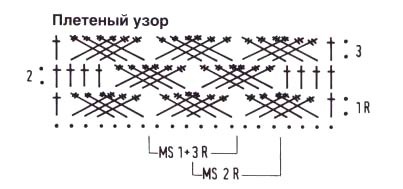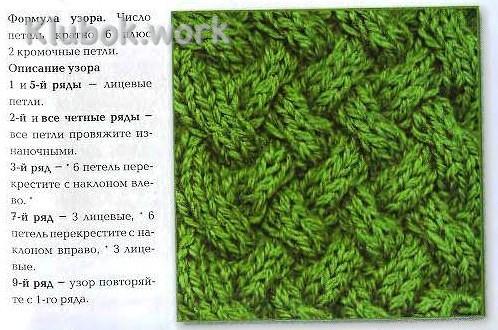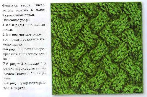 Для выполнения образца узора Плетенка следует набрать на спицы 26 петель. Количество петель при вязании этой вязкой должно быть кратно шести плюс две петли кромочные. И далее дается описание вязания по рядам узора Плетенка.