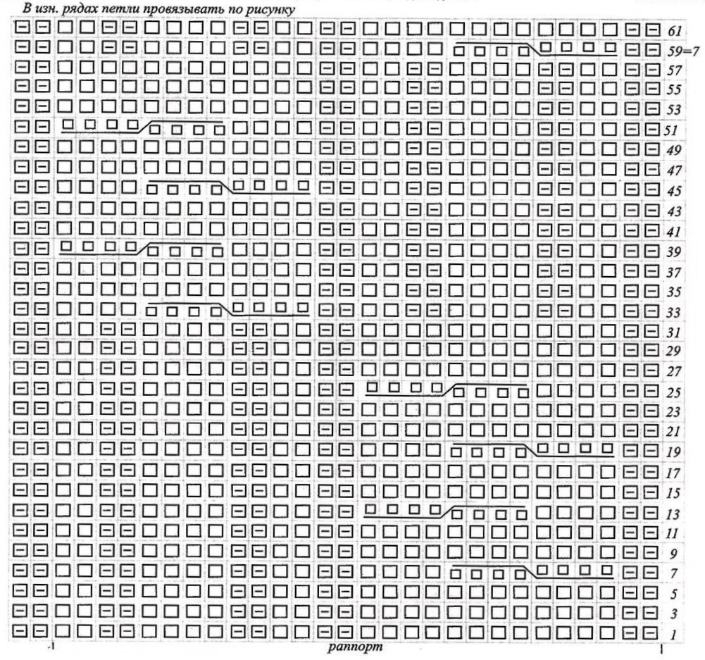Затем распределите петли следующим образом: кромочная, 2 изнаночных петли, 2 лицевых, 2 изнаночных, 4 лицевых, 2 изнаночных, 8 раз повторите раппорт (схема), 2 изнаночных, 4 лицевых, 2 изнаночных и 2 лицевых петли, кромочная.