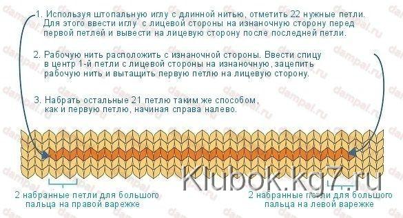 На тыльной стороне митенки, ориентируясь по местоположению 2-х набранных петель для большого пальца, набрать 22 петли, как показано на рисунке. Эти петли находятся в третьем ряду от набранных 2-х петель.