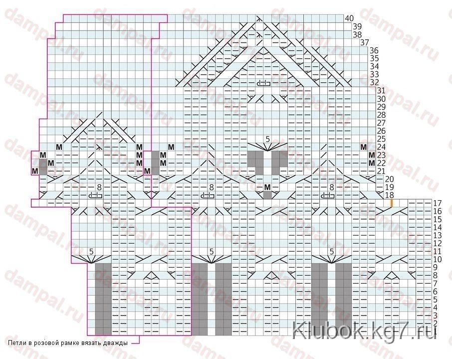 Следующие 6 круговых рядов: 23 лицевые петли, [2 изнаночные петли, 2 лицевые петли] – до 3-х последних петель ряда, 2 изнаночные петли, 1 лицевая петля.