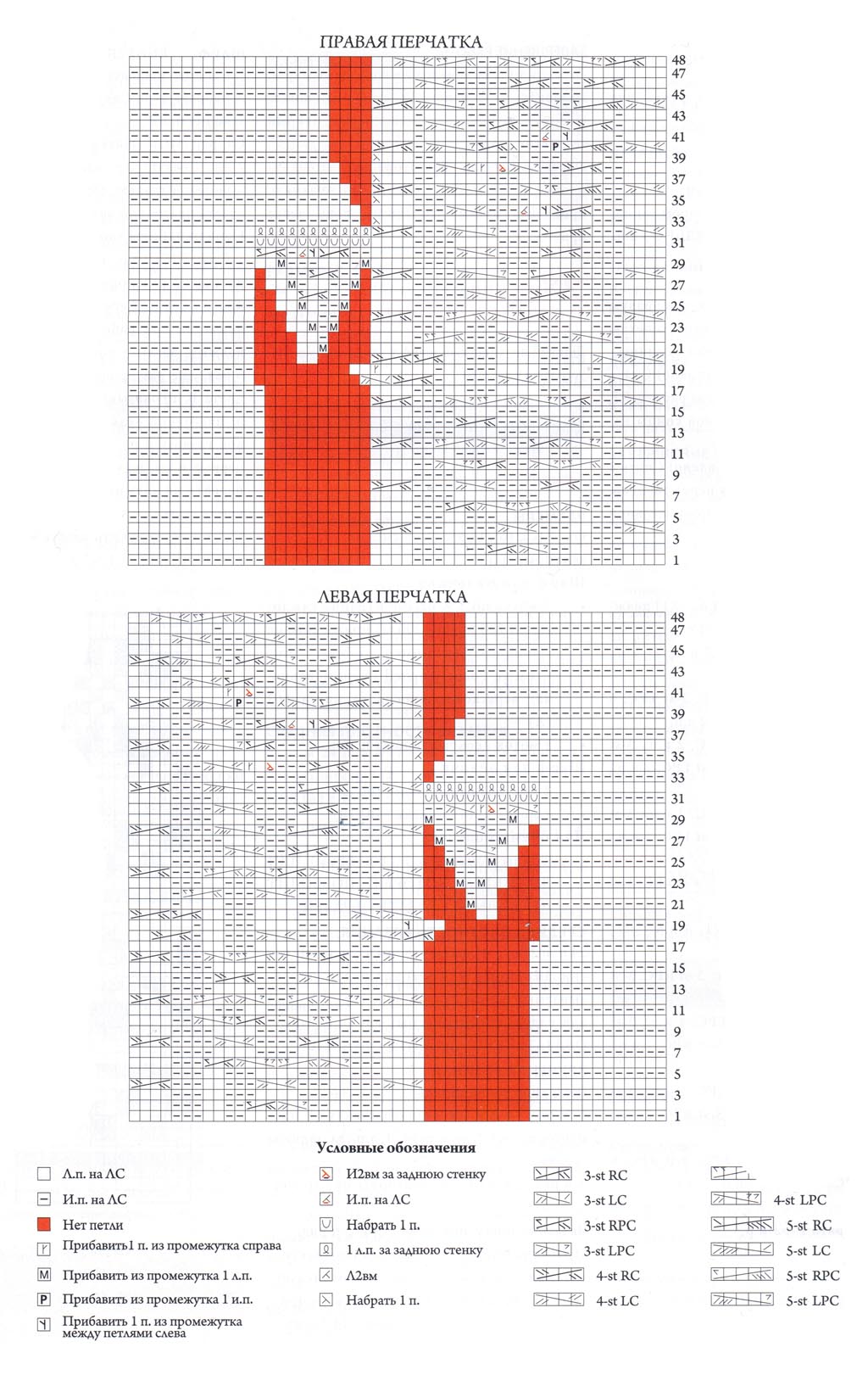 Вязать по схеме левой перчатки до 30-го р. 31-й ряд 12 и.п., как показано на схеме, снять сл. 11 п. гп нить из остатков для большого пальца, набрать 11 п. Как показано на схеме, вязать по схеме до 48-го р., снять последние 7 п.на чулочную спицу, для левого мизинца.