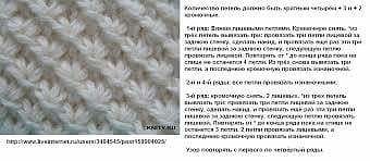 В данной статье предлагаем вашему вниманию вязание спицами узор звездочка. Такой узор будет отлично смотреться на различных вязанных вещах, таких как: шапка, пуловер, кофта и др. Описание работы: набираем число п. кратное четырем. После набора нужно связать все п. изнаноч. п. Первый р.: * одна лицев., одна “звездочка”*, повтор от * до *. заевршаем р. одной лицев. п. Второй р.: все п. изнаноч. Третий р.: * три лицев., одна “звездочка”*, повторяем от * до *, заевершаем р. 3 – мя лицев. п. Четвертый р.: все п. изнаноч. Повторяем с перового по четвертый р. “звездочка” – вяжем 3 п. вместе скрещен. лицев.. эти 3 п. с левой спицы не снимать, делаем 1 накид и снова вяжем эти же три п. вместе скрещен. лицев.