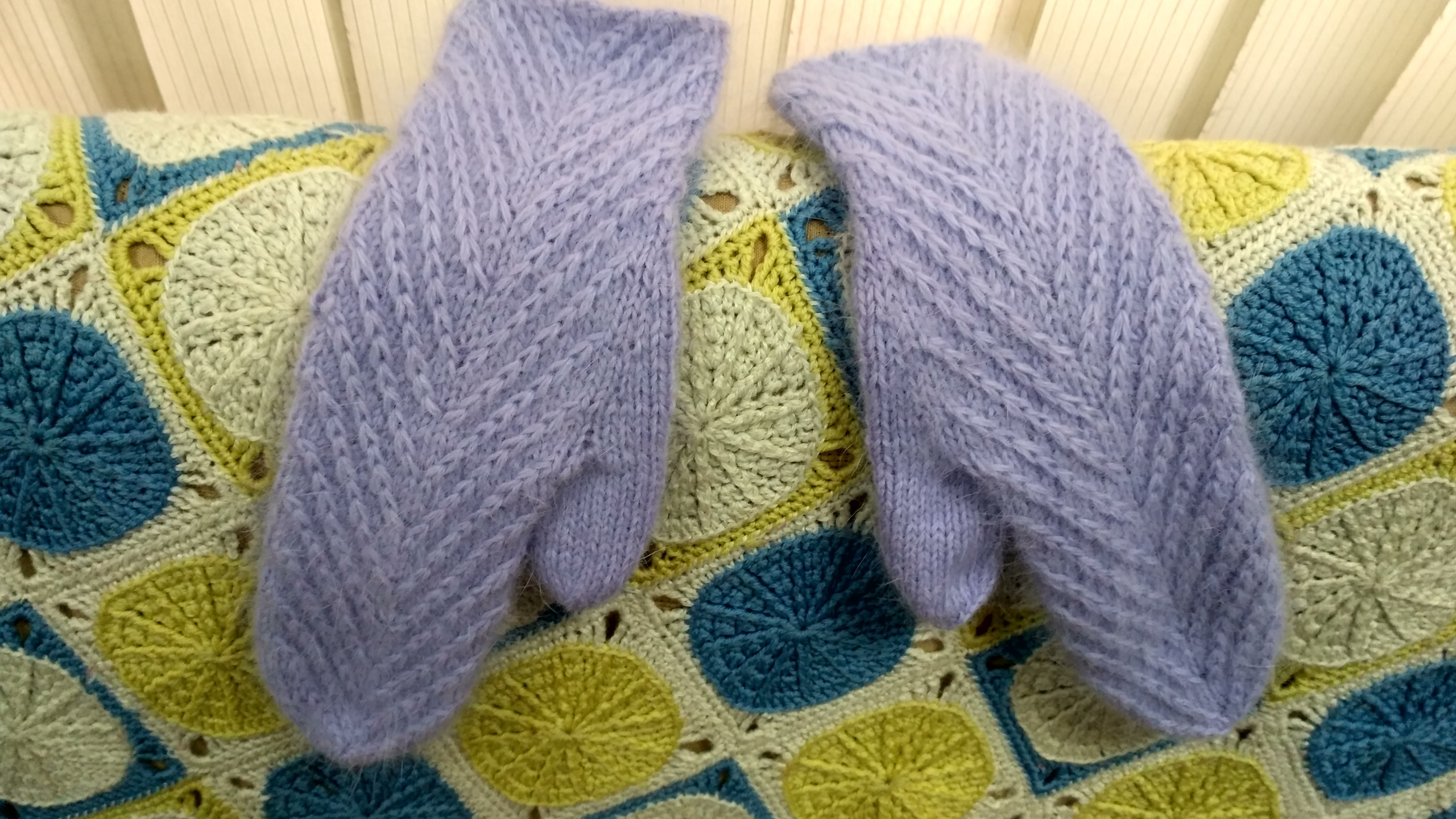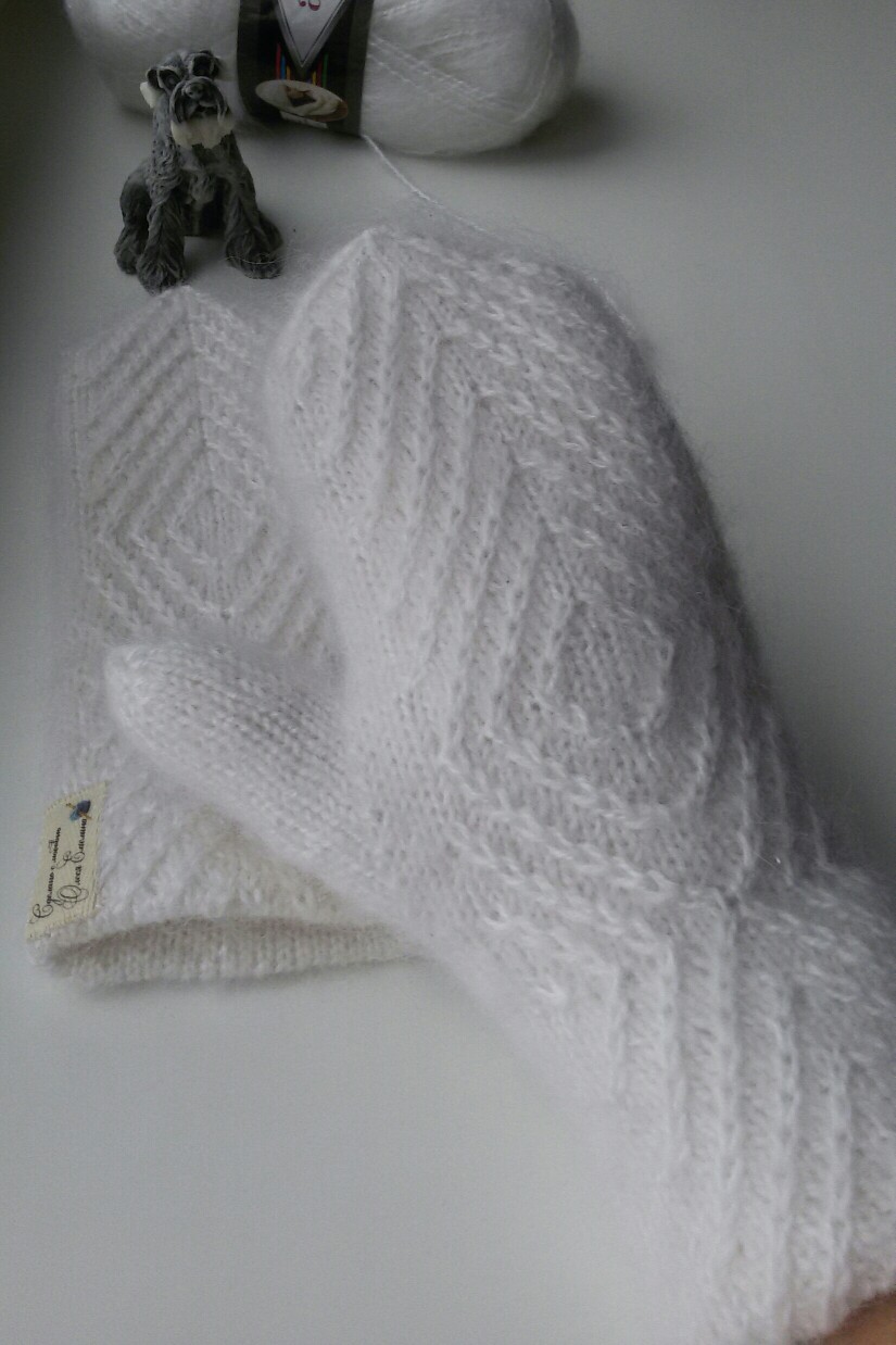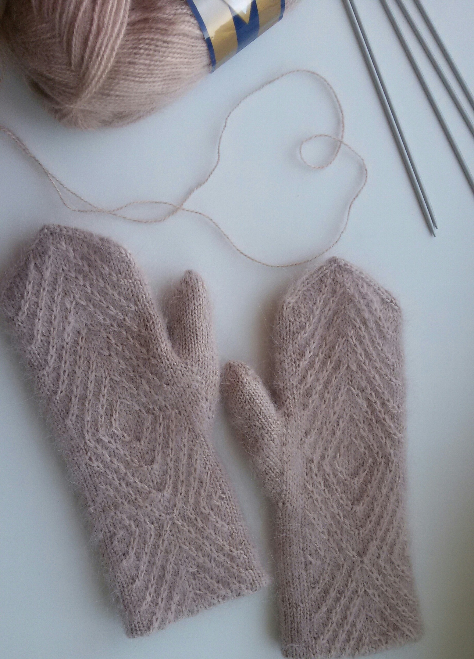Узор состоит из параллельных линий, связанных лицевыми петлями на изнаночной глади, которые то сходятся, то расходятся относительно центра варежек с лицевой стороны.