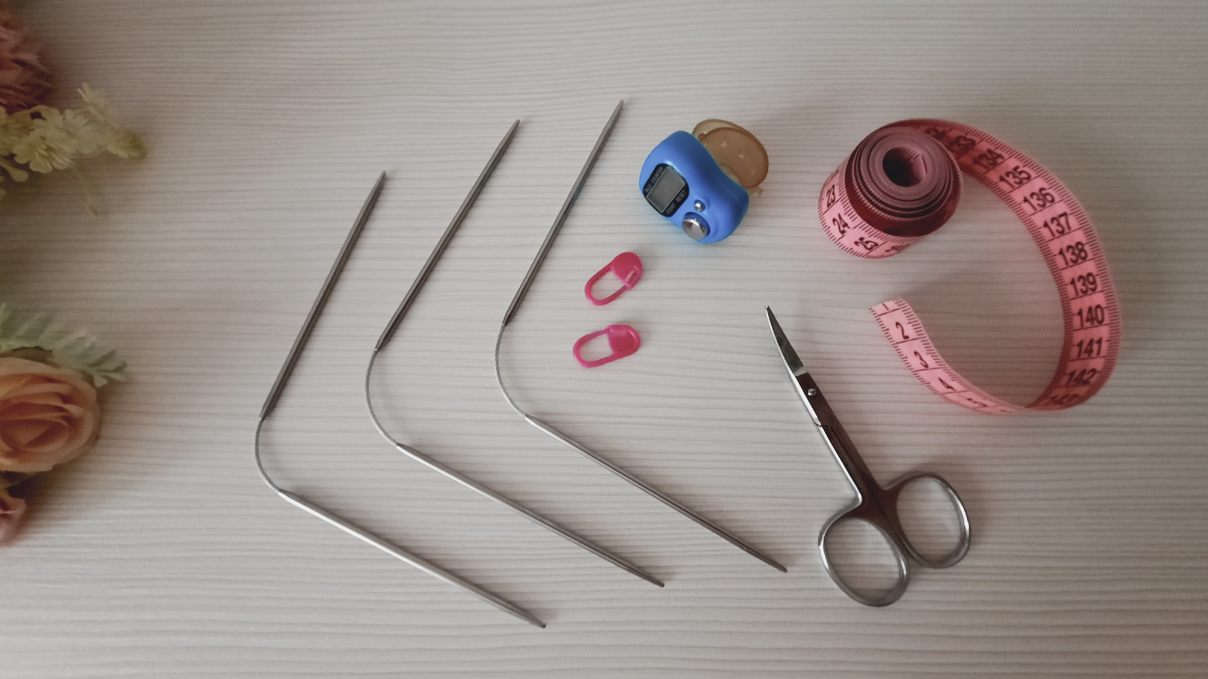 Также понадобились 2 маркера, ножницы, счетчик рядов, метр.