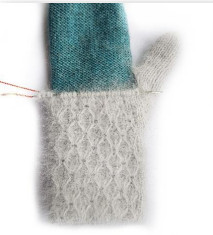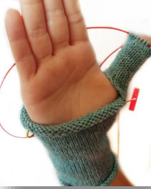 для правой варежки — в конце первой спицы (не забывайте, что сейчас мы вяжем внутреннюю варежку, и она вяжется зеркально по отношению к верхней варежке),