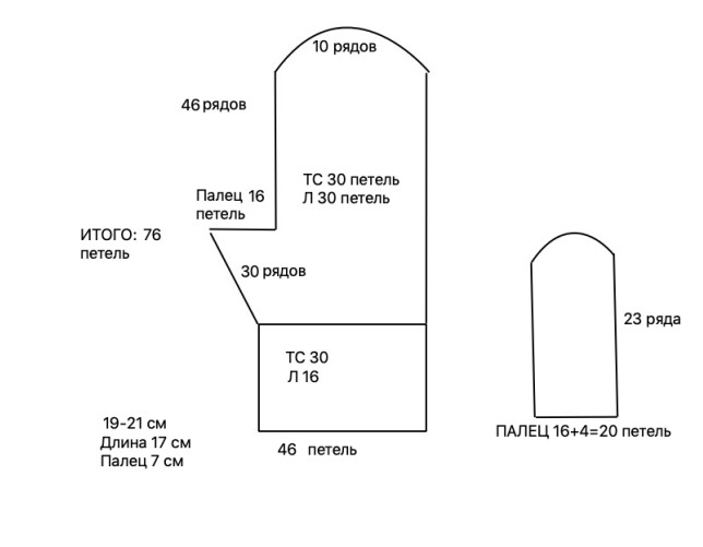 Л: (лиц., изн.) × 7, ПП, изн., лиц., изн. → 18 петель.Продолжать прибавки до 30-го ряда включительно, пока на ладони не станет 44 петли (всего 74 петли).