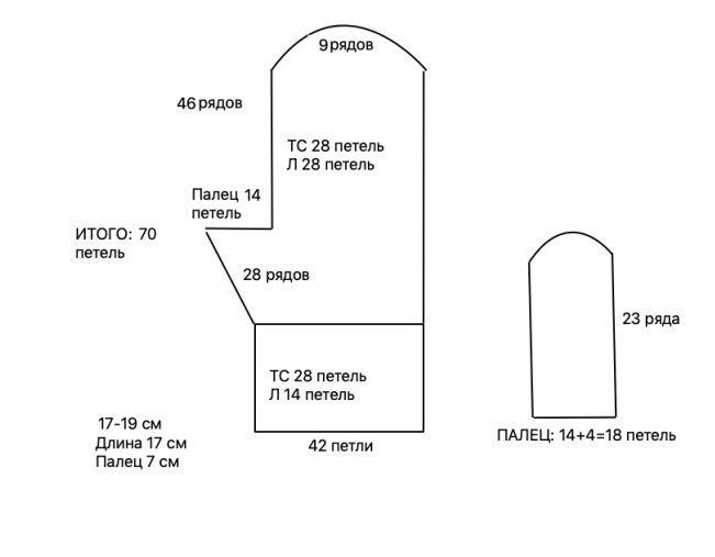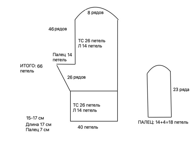 Л: (лиц., изн.) × 7, ПП, изн., лиц., изн. → 18 петель.Продолжать прибавления до 26-го ряда включительно, пока на ладони не станет 40 петель.