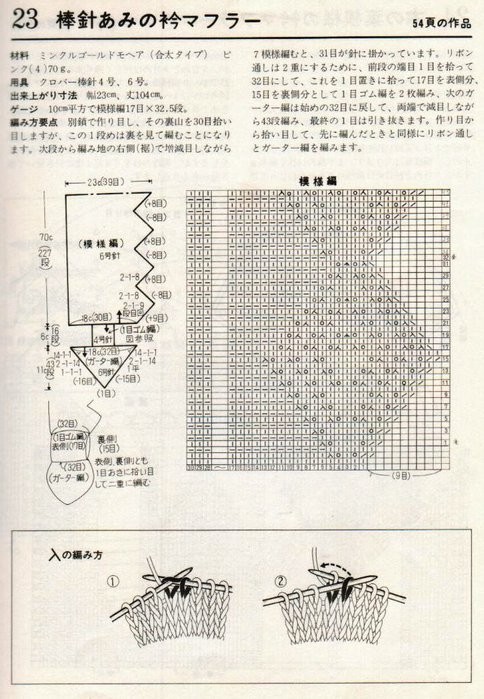 Набрать на бросовую нить 14п. и начать вязать узором «ветка листьев» (его описания нет). Затем удалить бросовую нить и надеть 14п. на спицу, вязать добавки след. образом: