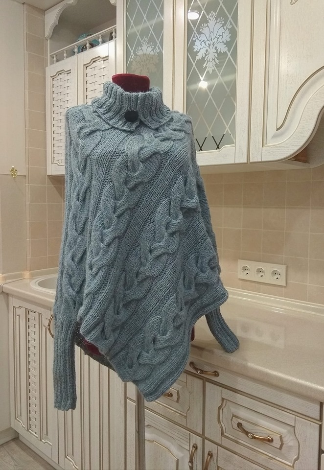 To knit the hood, you need to cast on 45 stitches. Next, you need to alternate knit and purl stitches (5 stitches each) twice. Knit the middle part of the fabric just like the heel of a sock. Knit 14 stitches, connecting all parts of the hood together and decreasing by 2 stitches every 6 rows. Sew the hood to the poncho and make 2 chains of 1 meter each. Finally, lace the chains along the sides of the poncho.