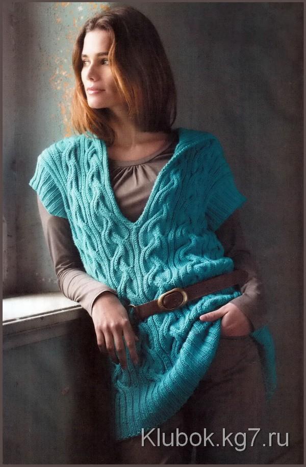 На высоте 68 см для выреза горловины сн. 15 п. с правой стороны на доп. спицу, затем закрыть по вырезу горловины в каждом 2-м р. 3 п., 2 раза по 2 п. и 4 (5) раза по 1 п.