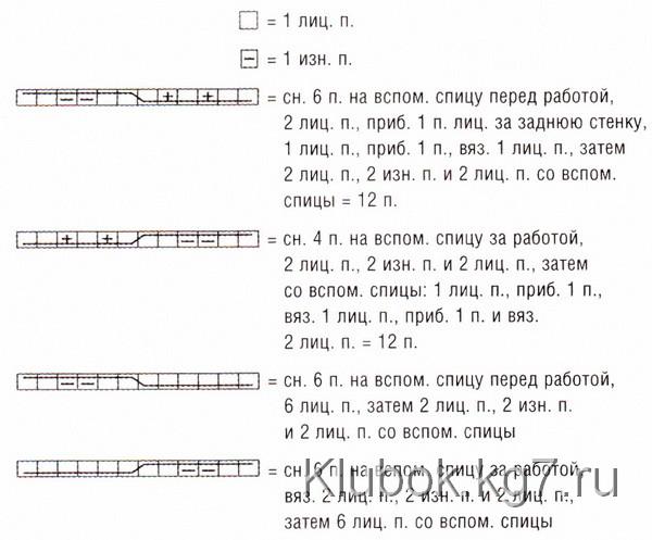 Показаны только лиц.р.; изн.р. вяз. по рисунку. Провязать 1-10-й р. (с приб.) 1 раз, затем повт.11-26-й р. Нижний р. без номера относится к рез.2х2.