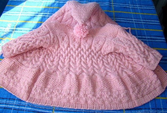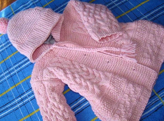 Для капюшона: набираем на спицы №3 44 петли (32+10планка+2 кромочные). При этом узоры выполняем на 32 петлях, а 10 петель планки – все время платочной вязкой. Для 32 петель + 2 кромочных вяжем «рисом» 12 рядов, одновременно выполняем прибавления слева в каждом втором ряду – 1 раз *3 петли, 3 раза *1 петля. Дальше вяжем «шахматкой» 12 рядов, 2 раза платочной, а потом продолжаем «рисом» - 8 рядов. После чего переходим к узору «медальоны» - вяжем 2 раппорта. Далее провязываем 8 рядов «рисом», и на последующих восьми рядах делаем в каждом втором ряду слева симметричные убавления – 3 раза *1 петля, 1 раз *3 петли. Дальше выполняем симметричную деталь капюшона. Провязываем узором «рис» 16 рядов. При этом, одновременно делаем прибавления слева в каждом втором ряду – 1 раз *3петли, 3 раза *1 петли. Дальше вяжем узором «медальон» два раппорта. После чего продолжаем узором «рис» 8 рядов, 2 ряда платочная вязка, «шахматка» - 12 рядов. Дальше вяжем 6 рядов узор «рис» и на последующих шести рядах делаем в каждом втором ряду симметричные убавления – 3 раза *1 петля, 1 раз *3 петли.