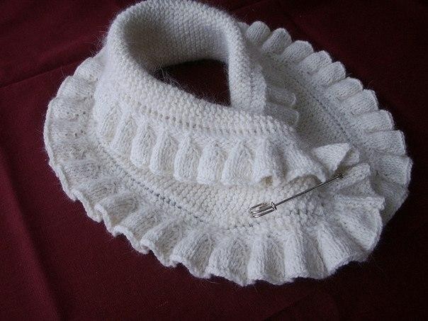 The last row is knitted in purl stitches, then the knitting is turned, and the stitches are closed with a hook in groups of 3 stitches, excluding the initial and final groups, where you need to knit 4 stitches together. Between groups, cast on 8-10 chain stitches. Between the points, cast on 3 chain stitches so that the collar does not "flap".