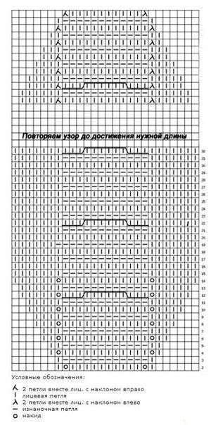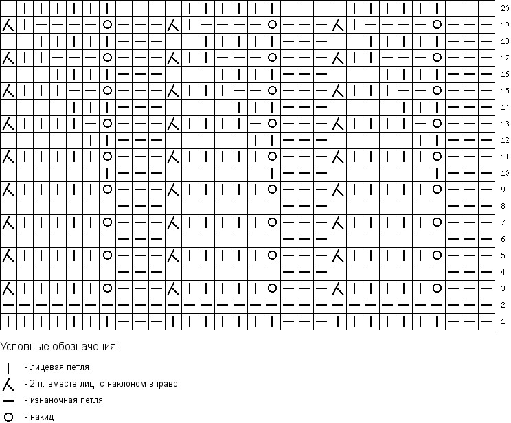 Но вроде схемка понятная. Единственный нюанс,который не знала, как отразить в схеме: первые 4 накида в рядах обычные, накид и накид... а вот с 5-го и до конца рапорта в высоту я делала перекрученный накид, чтоб он не дырочку давал, а просто петелку дополнительную.