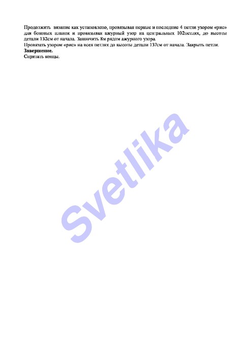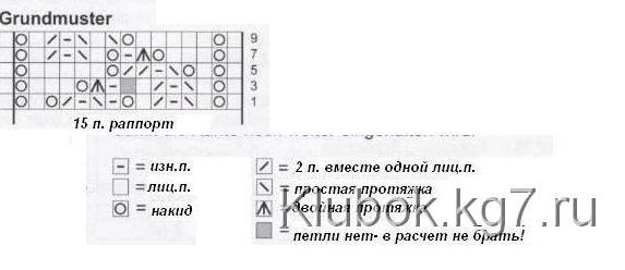 6-й ряд: *1 лиц., накид, 3 лиц., накид, двойная протяжка, 1 изн., 3 вместе лиц., накид, 3 лиц., накид, 1 лиц., повторять от *