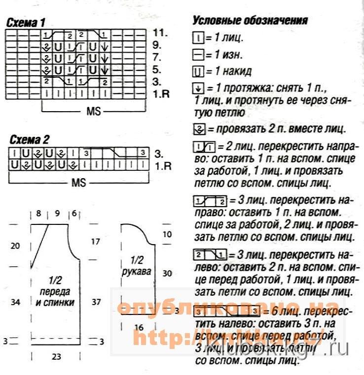 набрать 98 п. и связать для планки 3 см платочной вязкой. Затем вязать между кром. 42 п. узора 2, начиная с последних 6 п., 6 п. платочной вязки, 48 п. узора 1. На высоте 27 см связать на всех петлях 3 см платочной вязкой. Затем равномерно убавить между кром. на 48 п. 6 п. и вязать эти 42 п. узором 2, 6 п. платочной вязки, на следующих 42 п. прибавить 6 п. и вязать эти 48 п. узором 1. Через 40 см от наборного края закрыть для пройм с обеих сторон 4 п. и в каждом 2-м р. 1 х 3 и 1 х 2 п., затем закрыть с левой стороны 3?1 п. и с правой стороны 4 х 1 п. На высоте пройм 14 см вязать планку выреза горловины, для этого вязать платочной вязкой последние 13 п. узора 2, средние 6 п. и первые 15 п. узора 1. На высоте пройм 17 см все петли закрыть.