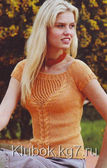 Перед: набрать 78 п. и связать 3 см резинкой. Затем петли распределить следующим образом: 29 п. лиц. глади, 20 п. косы, 29 п. лиц. глади. Выполнить приталивание с обеих сторон, как на спинке. Через 28 см от наборного края прибавить 1 п. и вязать ажурным узором. Выполнить скосы реглана с обеих сторон, как на спинке. На высоте спинки оставшиеся петли закрыть.