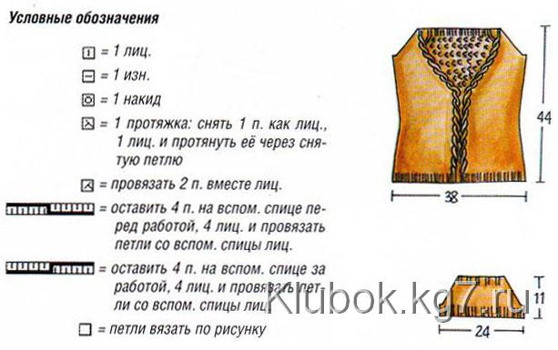 Коса (ширина 20 п.): 1-й и 3-й р.: 1 изн., 8 лиц., 2 изн., 8 лиц., 1 изн.; 2-й и все изн. р.: петли вязать по рисунку. 5-й р.: 1 изн., 8 п. перекрестить направо (оставить 4 п. на вспом, спице за работой, 4 лиц. и провязать петли со вспом. спицы лиц.), 2 изн., 8 п. перекрестить налево (оставить 4 п. на вспом. спице перед работой, 4 лиц, и провязать петли со вспом. спицы лиц.), 1 изн. Повторять с 1-го по 6-й р.