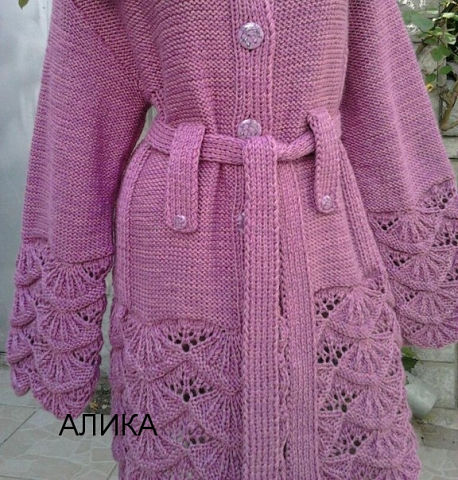 13ряд - 2 изн, *8 изн, провязать 4 изнаночные, снять их на дополнительнуюспицу,? обвить рабочей нитью против часовой стрелки 3 раза, снять их направую спицу, 9 изн*,