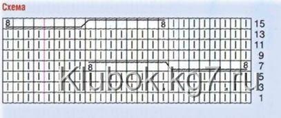13-й р.: 7 лиц., 8 п. перевести на вспомогательную спицу и оставить за работой. 8 лиц., 8 п. со вспомогательной спицы провязать лиц.. 15 лиц.;