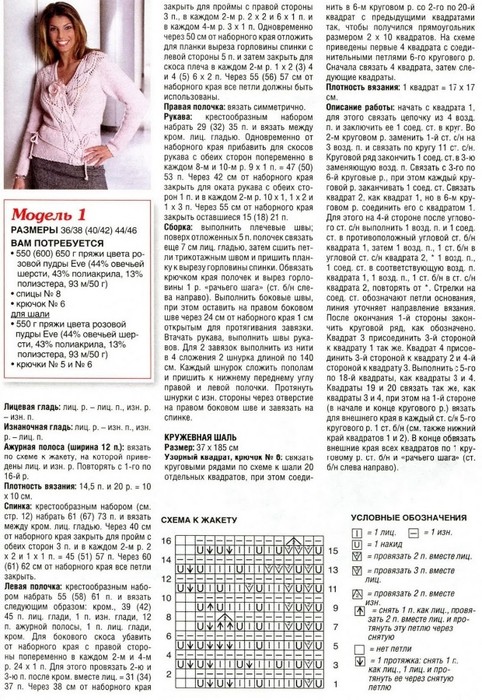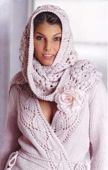 You will need: 550 (600) 650 g of powder pink Eve yarn (44% sheep wool, 43% polyacrylic, 13% polyester, 93 m/50 g); needles No. 8; hook No. 6.