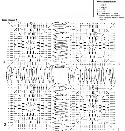 Pattern square, hook No. 6: knit in rounds according to the pattern 20 separate squares, connecting in the 6th round from the 2nd to the 20th squares with the previous squares to form a rectangle sized 2 x 10 squares. The pattern shows the first 4 squares with connecting stitches of the 6th round. First knit 4 squares, then the following squares.