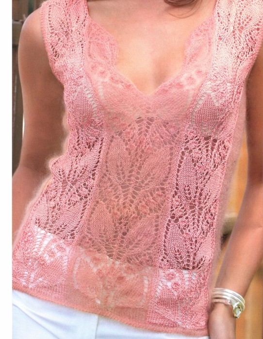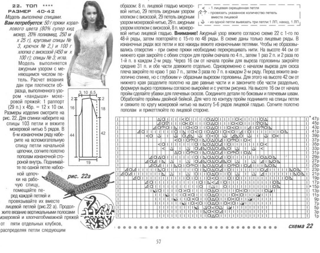 The top is knitted with mohair and cotton yarn in an openwork pattern with a symmetrical motif (see chart 22).