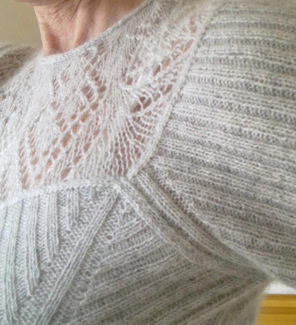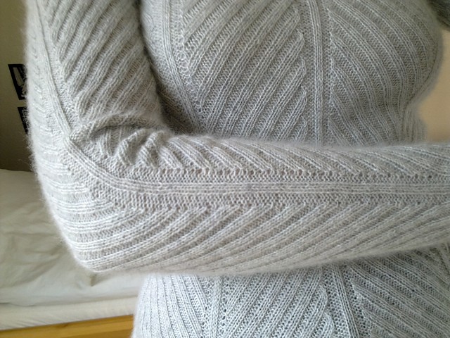 • две петли провязать вместе лицевой петлёй с наклоном вправо.