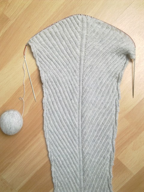 • две петли провязать вместе лицевой петлёй с наклоном влево;