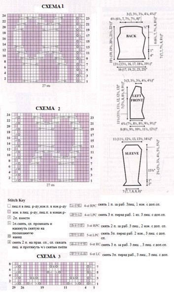 Следующий ряд ( лиц. сторона ) вязать 10 ( 10 , 10 , 14 , 14 , 14 ) петель жемчужным узором, 29 петель вязать по схеме 3 и до конца ряда вязать жемчужным узором, добавляя по 1 петле с каждой стороны каждый 12-й ( 10-й , 8-й , 10-й , 8-й . 6-й )