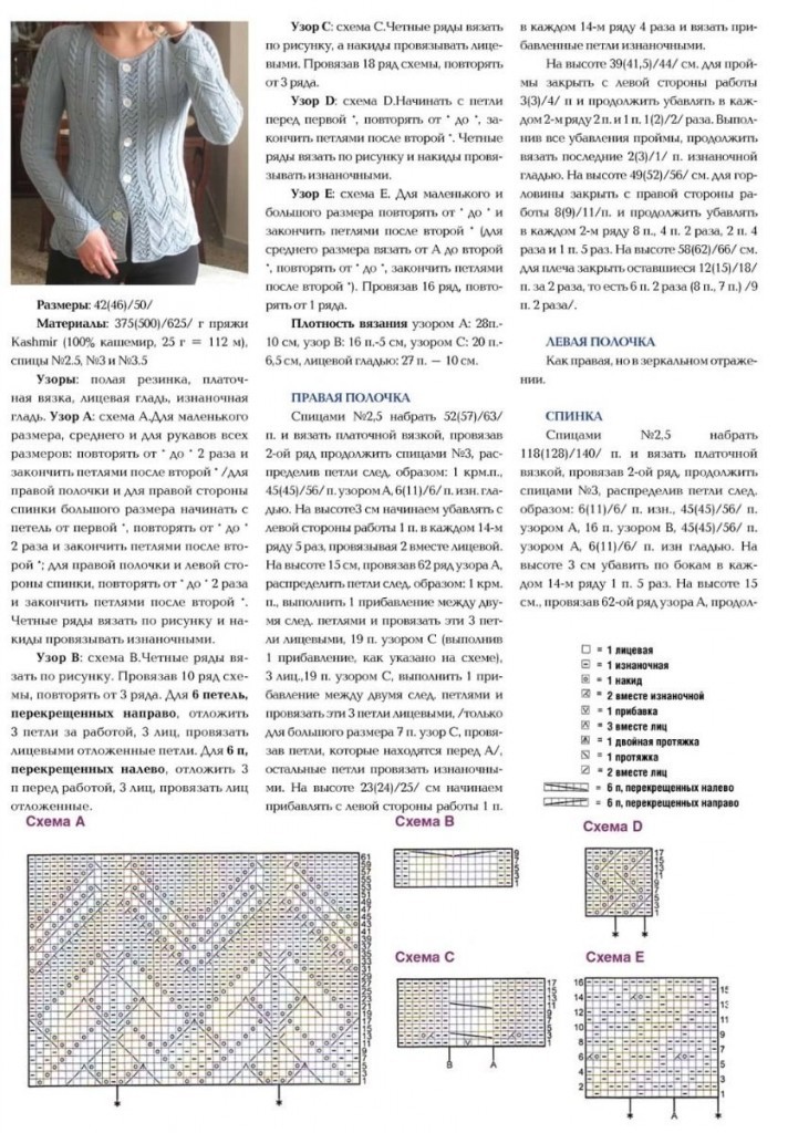 Условные обозначения (внизу справа): лицевая, изнаночная, накид, 2 вместе изн./лиц., протяжка, скрещенные петли и т.д.