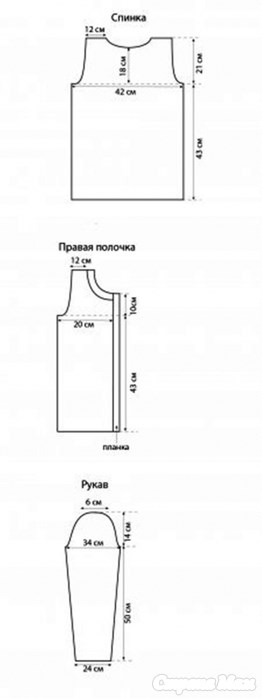 Правая полочка: на спицы №6 набрать 36 п. и вязать фантазийным узором. На высоте 43 см от начал вязания для пройм закрыть с правой стороны, как на спинке. На высоте 10 см от начала вязания пройм для выреза горловины закрыть с правой стороны в каждом 2-м р. 1 раз 8 п. и 3 раза по 1 п. На высоте 21 см от начала вязания проймы п. закрыть.