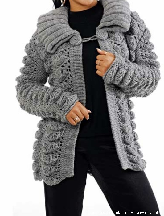 Элегантный серый жакет связан спицами ажурным объемным узором.