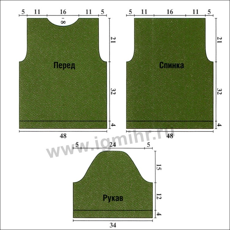 Перед. Вязать, как спинку. Для оформления линии горловины в 39-м ряду от начала линий пройм закрыть средние 15 п. и с обеих сторон от них в каждом 2-м ряду 2 раза по 3 п., 1 раз по 2 п., 3 раза по 1 п. На спицах = 26 п. В 61-м ряду от начала линии пройм все петли закрыть в одном ряду. Левое плечо выполнить аналогично.
