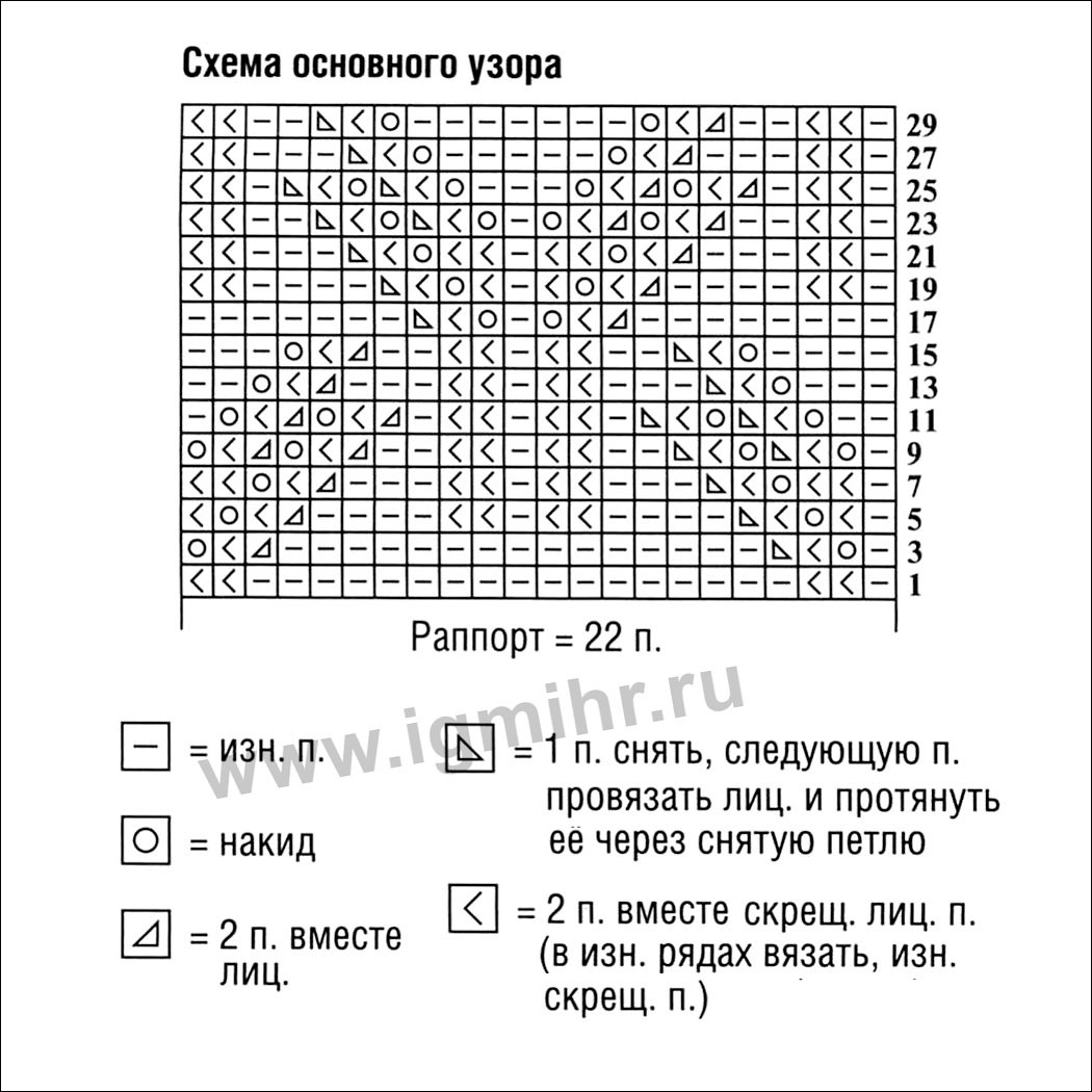 Основной ажурный узор: вязать по схеме. Повторить с 3-го по 30-й ряд включительно.