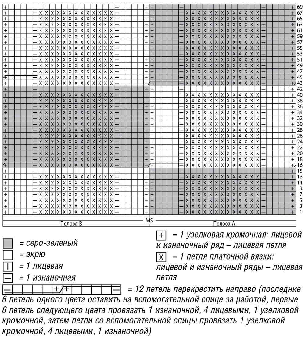 Узор состоит из связанных раздельно полос по 25 петель, которые соединяются друг с другом путем перекрещиваний в 16-м и 43-м ряду схемы. Общее число петель кратно 50; вязать согл. схеме. На ней даны только лицевые ряды. В изнаночных рядах петли провязывать по рисунку или согл. инструкции. Раппорт постоянно повторять.