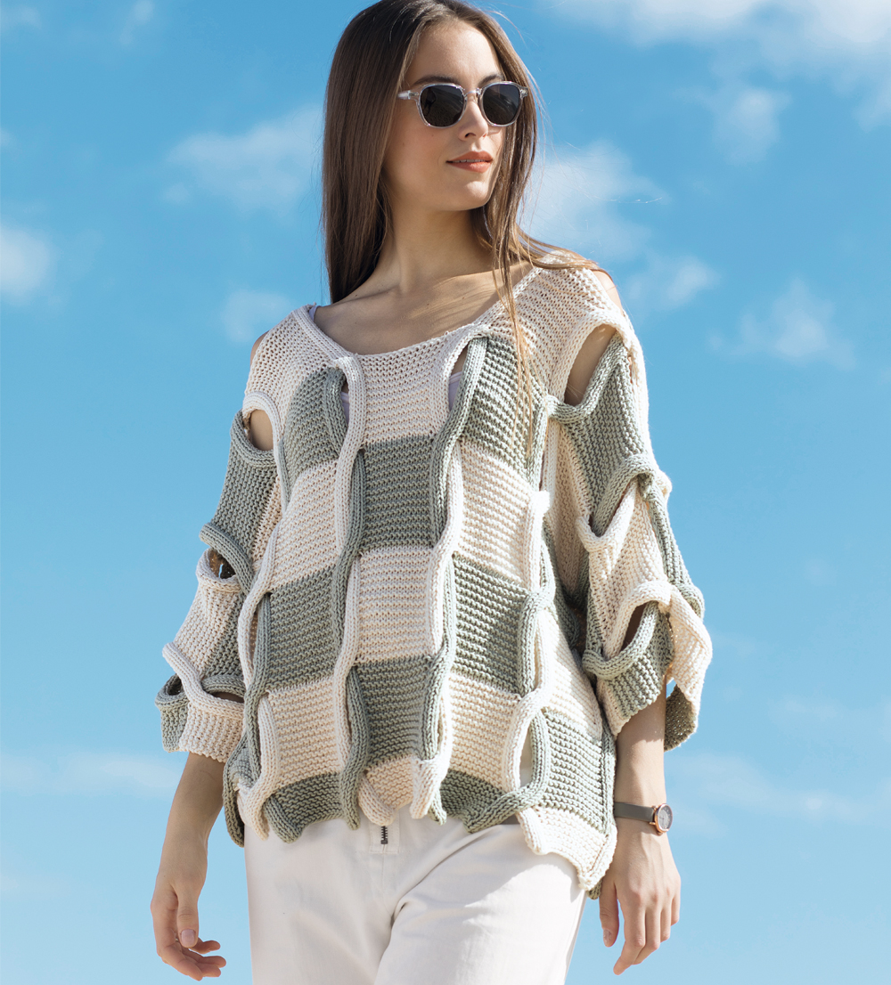 Пряжа (100% хлопка; 90 м/50 г) — по 300 г цв. экрю и серо-зеленой; круговые спицы №5.