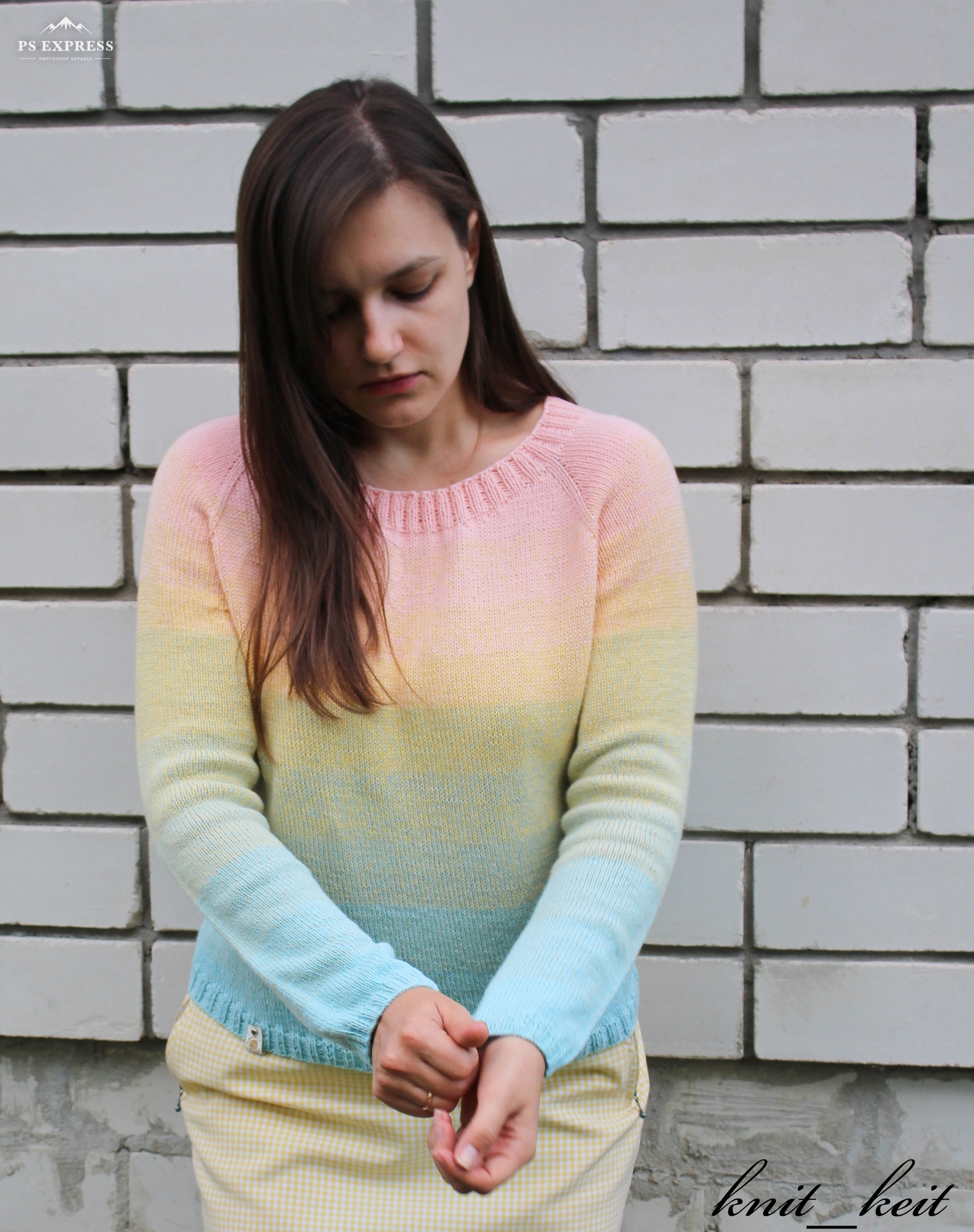 Из положительного: пряжа супер-приятная, в составе хлопок и панакрил (но кажется, что только хлопок), изделие получается невесомым и мягким. И конечно переход цвета. Это не секционно-окрашенная пряжа, в нить постепенно вплетается нить другого цвета. Я уже успела прогулять джемпер в +20 градусов, жарко в нем не было.