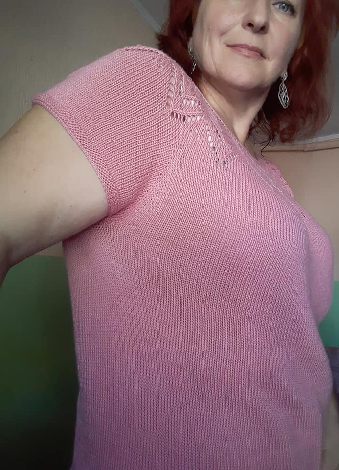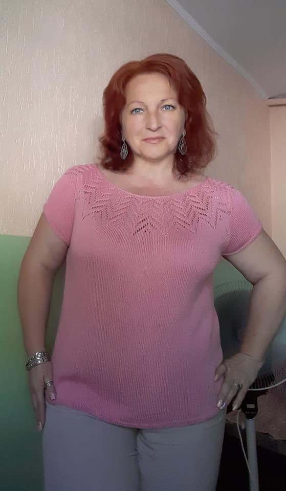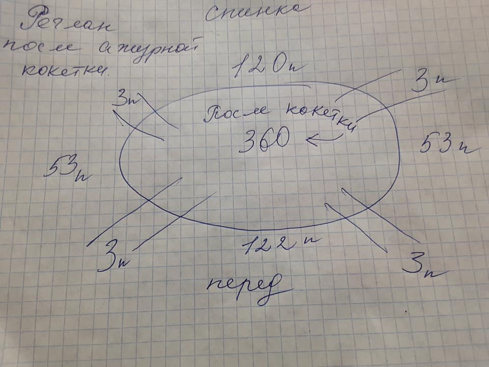 Первая круглая кокетка. Всегда думала что при широких плечах это не вариант,но этим летом очень многие их вяжут - и я туда же.Решила дать максимально подробную информацию,может кому пригодится.Пряжа Нако "Эстива"375м/100г, 50% хлопок,50%бамбук,очень приятная тактильно,полотно струящееся.Спицы 2мм горловина,обработка рукава и низа,основное полотно 2.5мм.Набрала 144п.,провязала 4р.изнаночными,дальше кокетка по схеме(прилагается).Отвязав кокетку разделила петли как на реглан(схема прилагается) 360п.Отвязав 12см реглана,отделила тело и рукава, сделала подрез на 14п.Далее вяжу тело,сделала три раза прибавки,по две петли с каждой стороны, для А-силуэта,обработала низ провязав 7 рядов платочной вязкой на спицах 2мм.Общая длина 63см.,ширина 58см.,свобода облегания 6см.После ВТО вятянулась в низ на 1.5см,в ширину на 2см,но вязала довольно плотно.Рукав- подняла петли по подрезу провязала 4р.лицевыми,после на спица 2мм 7 рядов платочной вязкой.Закрыла обычным закрытием,но изнаночными петлями.Вроде бы все. Одевала в жару - очень классно, не парит,все полотно струится и болтается. РОСТОК АЗИАТСКИЙ 3см перед подрезами, РАСХОД 275г, РАЗМЕР 52-54.